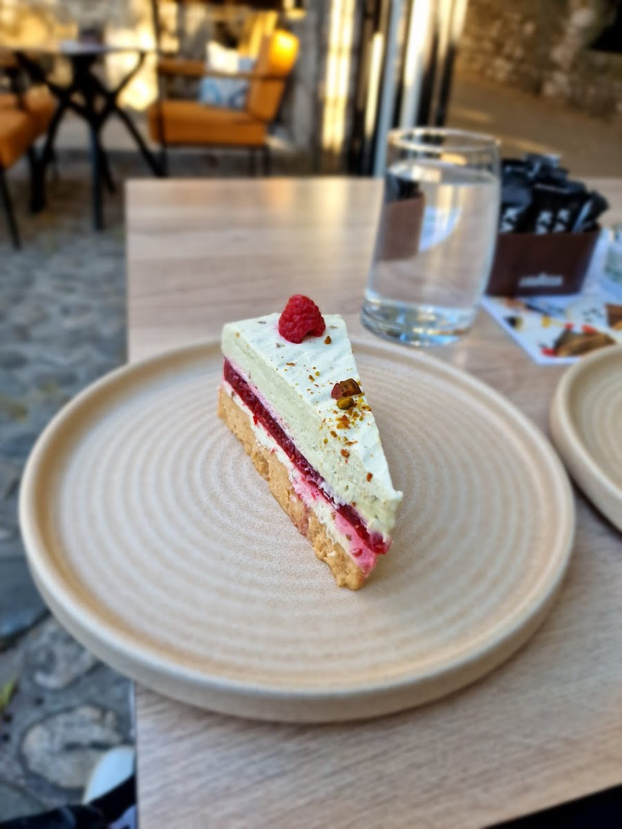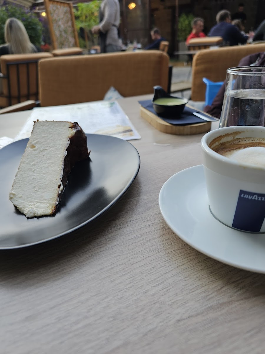 Went here for an afternoon snack and drink. I saw they use chain coffee beans (lavazza) so opted for a tea instead. Would be nice (and probably not even more expensive) to use some locally roasted beans. Anyway the tea was fine and I had a cheesecake with pistachio topping on the side too. Price was around 6KM but cash only so I don't remember exactly. The cake was honestly quite good. Not very sweet and creamy. The pistachio topping was quite sweet but the flavor was good and it was served on the side so you can adjust how much u use - very nice! Overall I would recommend this place for the cakes. For coffee I'd go to Fabrika next door though. They share the same space so it can be a bit confusing to find the one you want.