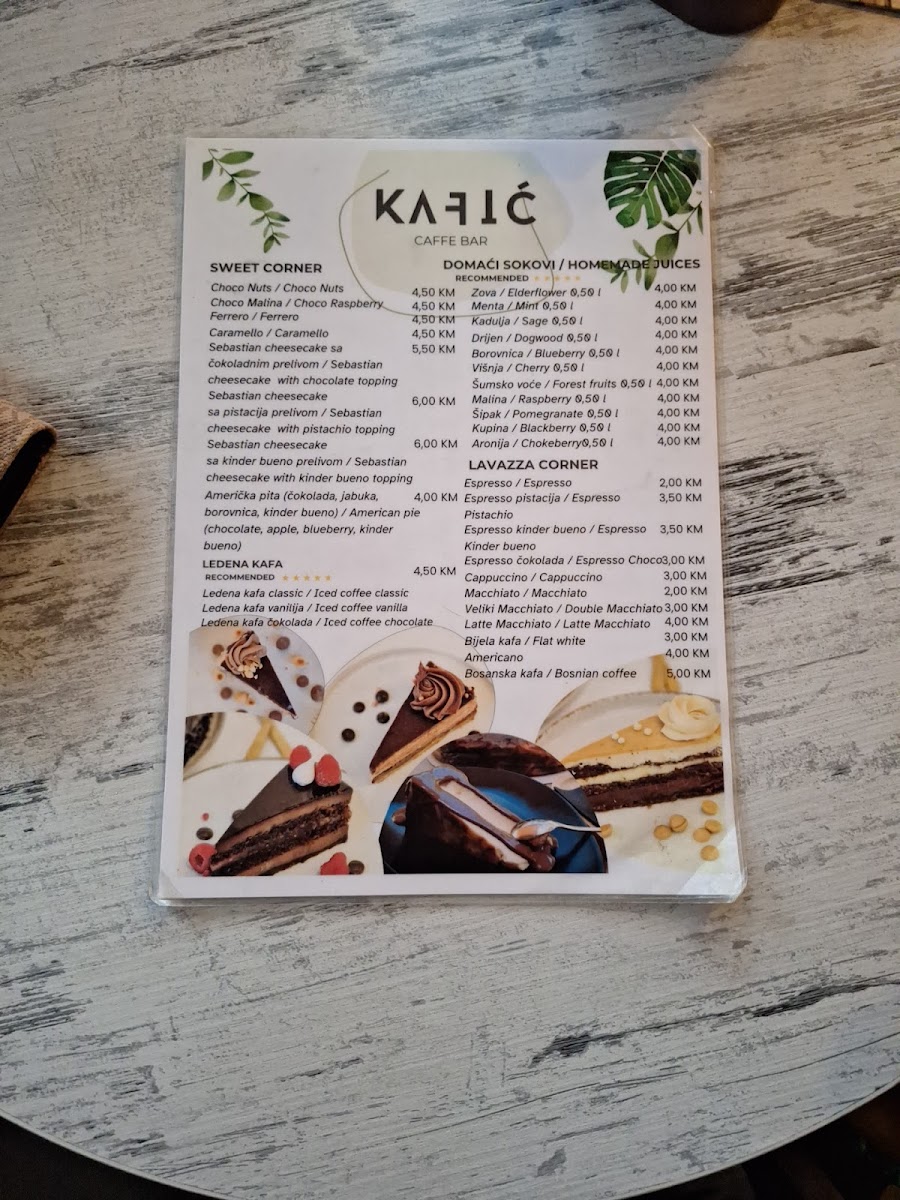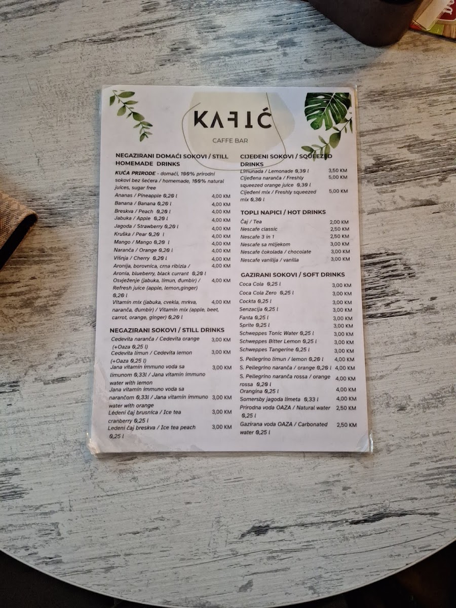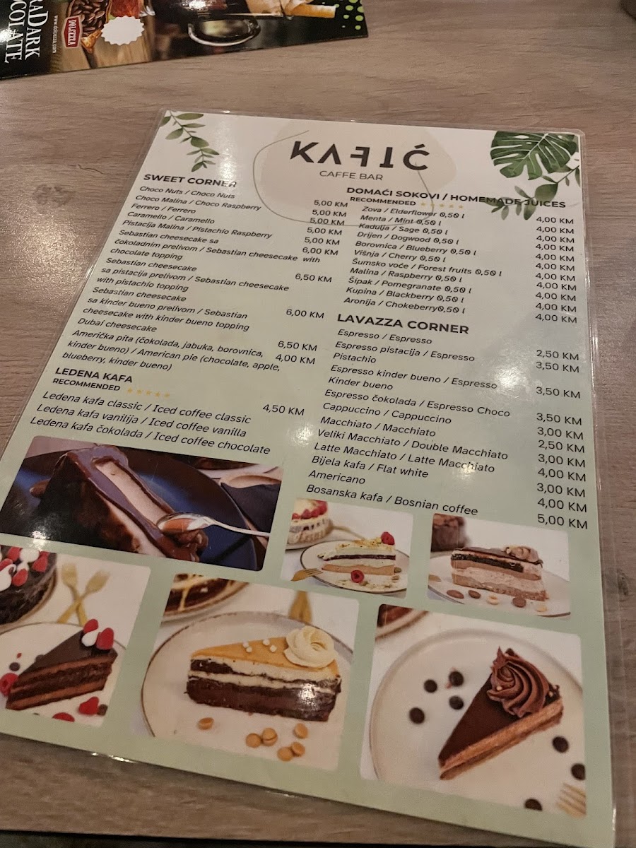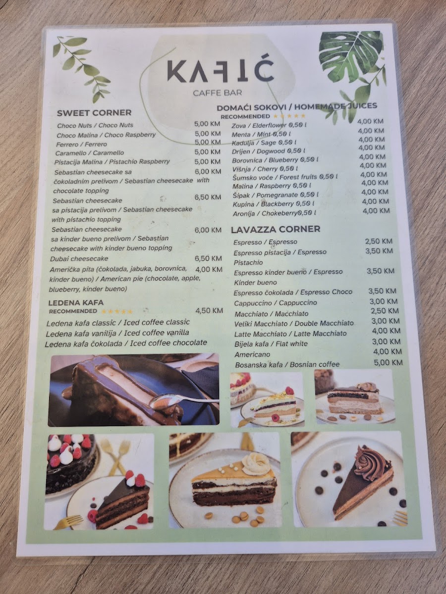 The menu at Caffe bar Kafić offers a cozy selection typical of a local café and pastry shop, focusing on comforting drinks and a variety of homemade cakes that pair well with relaxed, everyday moments. Whether you’re stopping by for a quiet coffee break or a casual meet-up with friends, the menu provides familiar flavors with a touch of indulgence.